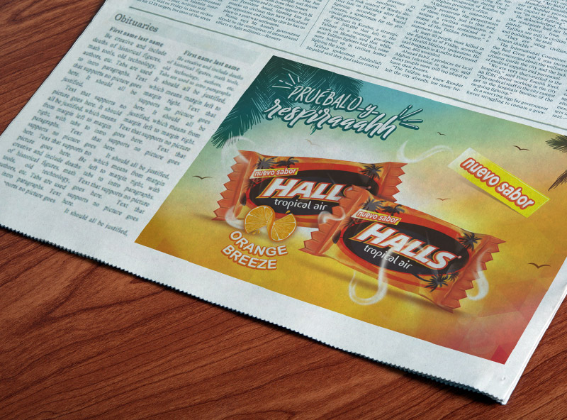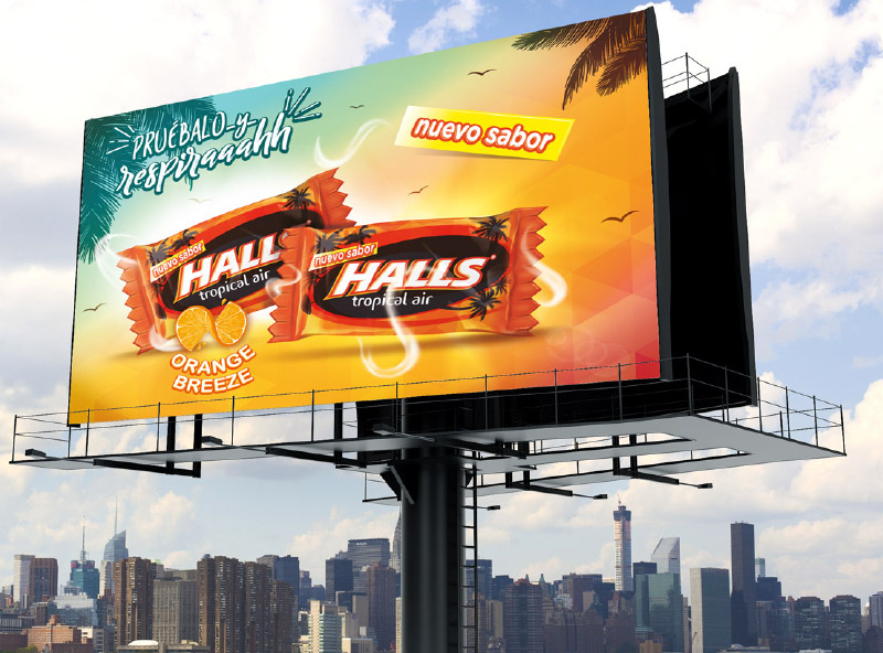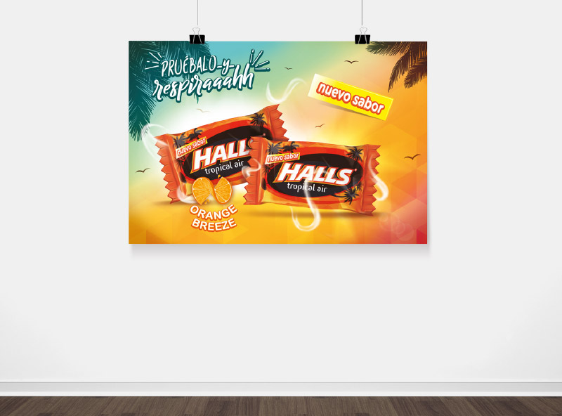 Tropical air y Firenze fueron dos campañas que se realizaron para Halls, la marca de caramelos más famosa del mundo. Se necesitaba hacer un lanzamiento del nuevo sabor Tropical air y usando unicamente el arte del producto que nos suministró el cliente generamos el visual con el concepto de frescura caribeña con un sol de atardecer que coincidía con el sabor a naranja del caramelo. Cabe anotar que este trabajo fue realizado en 3 días y aprobado con muy pocos comentarios por parte del cliente. En nuestra agencia entendemos que el plus de la velocidad es oro en el sector publicitario.