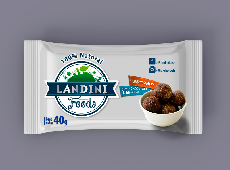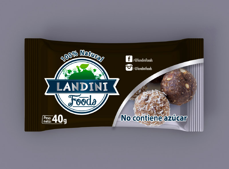 LANDINI FOODS es una nueva propuesta para comida saludable. Se trata de unas bolitas dulces con sabor a chocolate 100% natural, unos snacks sin conservantes ideales para el mercado fitness. Aquí nuestro acompañamiento fue total con esta nueva empresa emprendedora, desde el análisis del material e ingeniería de empaque, hasta el diseño mismo del logotipo. A propósito de éste, debía ser genérico pues acompañarí a nuevos productos naturales fitness. Se diseñó un empaque limpio y glamoroso que encontrará su lugar rápidamente en el mercado de los fitness.