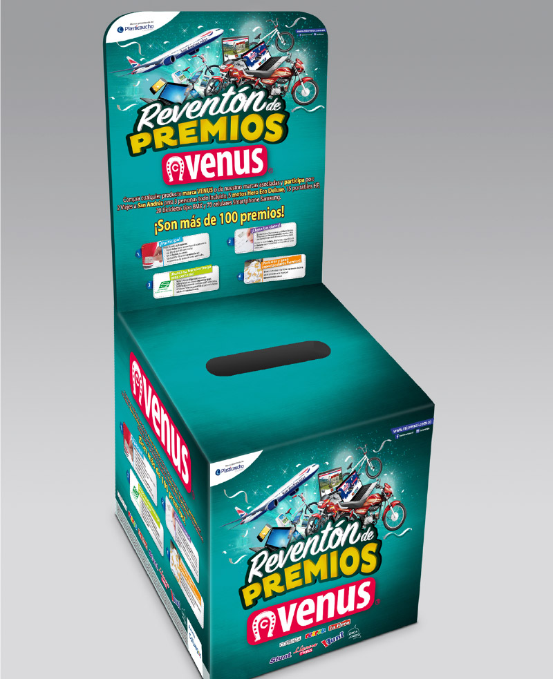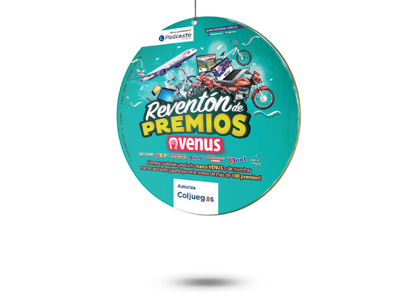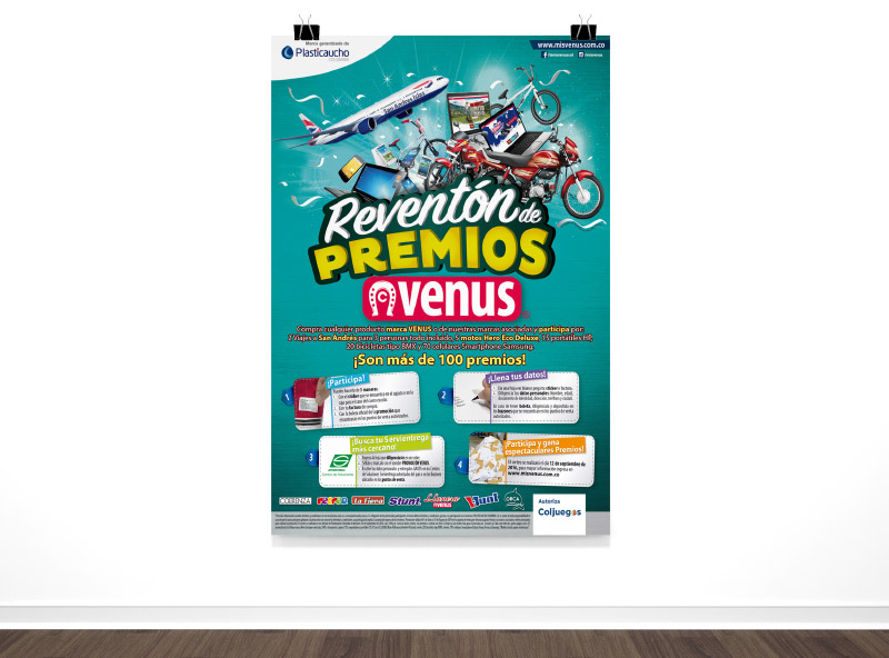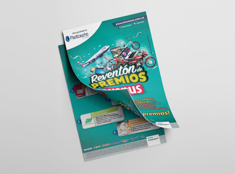 REVENTÓN DE PREMIOS, fue una campaña realizada para Plasticaucho S.A. en donde se rifaron destinos turísticos, motos, celulares, etc.. Empleamos un lenguaje claro e imponente con una composición de diferentes premios de todos los tamaños y colores que salen de manera ascendente detrás del título, como si de una explosión se tratara. Se utilizó un fondo texturizado con un color neutral que ayudara a resaltar la variedad de colores que tendríamos con los premios. Por último un paso a paso explicando la dinámica de la actividad.